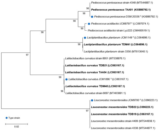 The genetic analysis of the presumptive LAB isolates identified the following genera: Pediococcus (one isolate), Latilactobacillus (three isolates), Leuconostoc (two isolates), and Lactiplantibacillus (one isolate) (Table 2). The BLAST hit displaying the maximum identity and query length was used as the closest relative of the isolates whose sequences were acquired. All isolates exhibited a similarity of >99% with the nucleotide sequence database of the National Center for Biotechnology Information (NCBI). The genetic sequence of each isolate was deposited in the NCBI GenBank database, and accession numbers were obtained. The identification and classification of the isolates were further confirmed by phylogenetic tree analysis (Figure 1), where each LAB isolate (written in bold) was classified with type strains (indicated by blue dots and “T” superscripts) and other similar strains in the database.