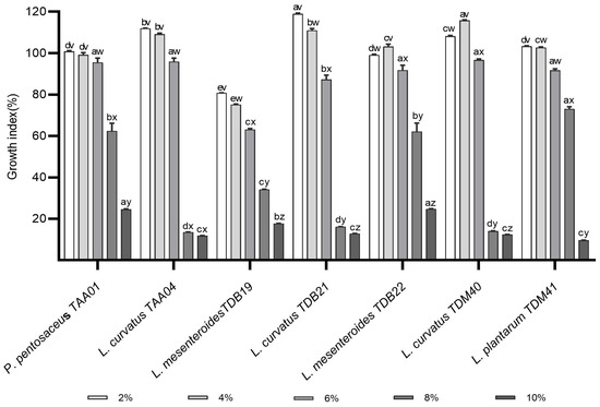 The alcohol content of Tella varies between 2% and 8% v/v [3]. High alcohol concentration affects both the growth and activity of LAB. When the concentration of ethanol surpasses a specific threshold, LAB are unable to autonomously sustain cellular stability, potentially leading to cell death. This outcome is attributed to intracellular metabolic imbalance resulting from the disruption of cell membrane functions [33]. Therefore, starter LAB strains to be employed in Tella fermentation as well as other food fermentations should have better resistance to alcohol stresses. In the present study, the alcohol tolerance of each LAB isolate was determined for ethanol concentrations ranging from 2 to 10% (Figure 2). As shown in Figure 2, there is a decreasing trend of GI of LAB isolates with the increase in ethanol concentration. The average GI was 104.2 ± 13.5%, 102.3 ± 13.2%, 88.9 ± 12.1%, 39.4 ± 26.0%, and 16.3 ± 6.2% for ethanol concentrations of 2%, 4%, 6%, 8%, and 10%, respectively. Notably, the GI values for certain isolates at 2% and 4% exceeded those of the control, indicating a potential promotion of their growth at lower alcohol concentrations. Such growth promotion at the low alcohol concentration may be due to the adaptation of the isolates to alcoholic conditions, where the LAB isolate may have developed different ethanol tolerance mechanisms. Among the isolates, P. pentosaceus TAA01 and L. curvatus TAA04 were not significantly inhibited by the increase in ethanol from 2% to 4%. At a 6% ethanol concentration, the GI of LAB isolates varied in the following order from highest to lowest: L. curvatus TDM40 (96.7 ± 0.5)%, L. curvatus TAA04 (95.9 ± 1.7)%, P. pentosaceus TAA01 (95.5 ± 2.1)%, L. mesenteroides TDB22 (91.8 ± 2.4)%, L. plantarum TDM41 (91.7 ± 0.7)%, L. curvatus TDB21 (87.3 ± 2.0)%, and L. mesenteroides TDB19 (63.1 ± 0.5)%. In this ranking, there is no significant GI difference (p > 0.05) among the top five isolates (Figure 2). As the ethanol concentration rose to 8% and 10%, the tolerance capabilities of LAB isolates exhibited more pronounced variations. P. pentosaceus TAA01, L. mesenteroides TDB22, and L. plantarum TDM41 were the most tolerant in 8% ethanol, and P. pentosaceus TAA01, L. mesenteroides TDB19, and L. mesenteroides TDB22 were the most tolerant at a 10% ethanol concentration. These findings closely agree with the study of [33,34]. Another study by Jin et al. [35] reported that L. paracasei isolates displayed a 5% alcohol tolerance. Compared to these previous studies, three isolates in the present study including P. pentosaceus TAA01, L. mesenteroides TDB22, and L. plantarum TDM41 exhibited a better GI (above 62%) under an 8% alcohol level. Remarkably, when subjected to the 8% ethanol concentration, L. plantarum TDM41 demonstrated a better GI of 73.08%, surpassing the earlier reported GI value of L. plantarum LTJ12 (59.01%) by Wang et al. [34]. Isolates of LAB with better alcohol tolerance have the potential to improve fermentation efficiency and stay viable during storage. This is particularly significant because such tolerant LAB strains could be incorporated into products delivered to consumers, ensuring viable probiotic counts and delivering health benefits. The findings of the current study, particularly those regarding the top three alcohol-tolerant isolates, indicate promising opportunities for developing functional cereal-based alcoholic beverages that cater to consumers seeking non-dairy options. However, further studies using Tella fermentation models are required to establish more robust conclusions.