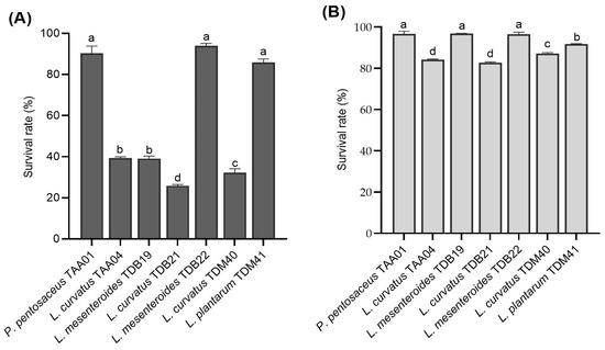Survival rates of autochthonous lactic acid bacteria isolates following exposure to (A) low pH (3.0) for 3 h and (B) bile salt (0.3%) for 4 h (count, log CFU/mL). Values are expressed as mean ± SD (n = 3). Different superscript letters (a–d) indicate a significant difference (p < 0.05).