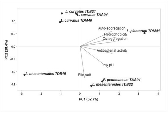 Principal component analysis of probiotic properties (low pH resistance, bile salt resistance, auto-aggregation, co-aggregation, cell surface hydrophobicity, and antibacterial activity) of seven autochthonous lactic acid bacteria isolates. The graph is a biplot displaying the projection of variables and LAB isolates formed by the two major principal components.