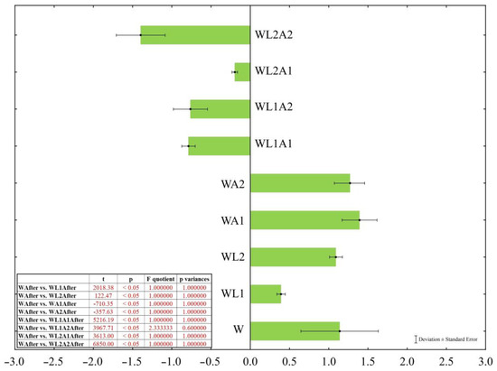 After placing the cheeses in their designated covering liquids, significant changes in the cheese’s mass and liquid properties were observed (Table 2). When the obtained values were compared with that of the control sample (W) using an independent samples test, it highlighted that statistical differences were significant (p < 0.05). Hence, the influence of modifying the covering liquid’s composition on the cheese mass was evident. The t-test values are shown in Figure 1. The mass of the cheese placed in the control liquid without additives (W) showed a 1.14 ± 0.49% increase (from 220.04 ± 0.02 g to 222.55 ± 3.68 g; p < 0.05). Analysis of the properties of this liquid revealed that its water activity decreased (from 0.9906 ± 0.001 to 0.9843 ± 0.002; p < 0.05), pH increased (from 6.521 ± 0.00 to 6.672 ± 0.02; p < 0.05), the freezing point decreased (from −0.6761 ± 0.00 °C to −0.6952 ± 0.00 °C; p < 0.05), and the salinity reduced (from 8.70 ± 0.0 g/dm3 to 8.40 ± 0.0 g/dm3; p < 0.05), resulting in diminished conductivity (from 35.62 ± 0.3 mS/cm to 34.45 ± 0.1 mS/cm; p < 0.05; p = 0.002).