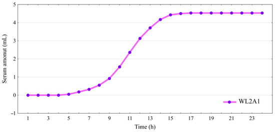 Similar studies on the leachate of the water–fat fraction were carried out on cheese made from a mixture of cow’s and sheep’s milk (CSB) in a ratio of 70:30, which was stored in traditional brine [30]. When the leachate results for WL2A1 cheese and CSB cheese were compared, it was found that the leachate for the CSB cheese made from cow’s and sheep’s milk in 70:30 ratio stored in brine was much larger in total. Moreover, it occurred much faster, already within the first hour after unpacking and quartering (0.22 mL). The sum of the leachate was 24.55 mL, which was almost 5.5 times more than for WL2A1 cheese. This proved that storing the cheese in a covering liquid with a modified composition could positively affect reducing the amount of leachate from the mozzarella cheese mass.