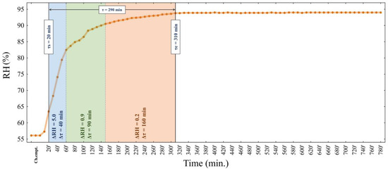 The analysis of water mobility expressed as relative humidity RH (%) at a specific time showed that the stabilisation of the equilibrium relative humidity in the surroundings of the cheese sample taken from WL2A1 covering liquid lasted approx. 5 h (Figure 3). The phase of translational water movement in this cheese lasted 290 min (τe = 310 min). At that time, three areas related to the intensity of transfer were identified. In the first one (for τs = 20 min), the average ΔRH was 5.0 for Δτ = 40 min; in the second, ΔRH = 0.9 for Δτ = 90 min; and in the third, ΔRH = 0.2 for Δτ = 160 min. The last one was the transformation of the translational motion of water molecules before entering the surface exchange region and establishing an equilibrium state. By parameterising the kinetics of translational movement, it was shown that the time to reach the maximum velocity was τm = 20 min for vm = 0.31 RH/min.