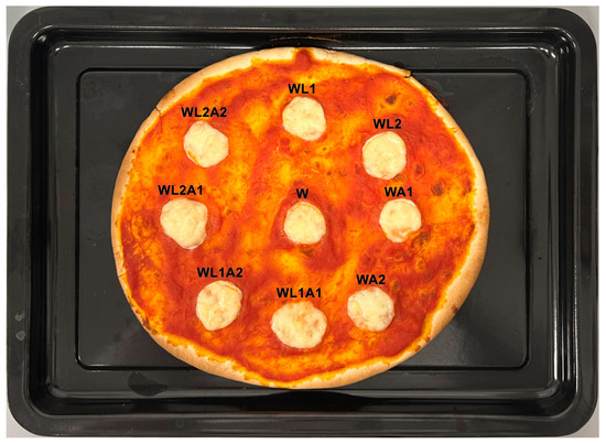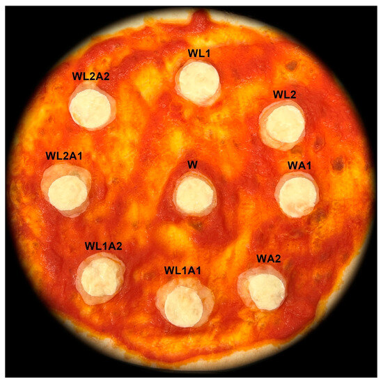 The pizza baking test was used to evaluate mozzarella cheese as a pizza topping. For this purpose, the methodology described by Rudan and Barbano [24] with modifications was used. Pizza was made by spreading 120 g of tomato sauce (GustoBello, Jeronimo Martins Polska S.A., Kostrzyn, Poland) on a round 25 cm pizza crust (GustoBello, Jeronimo Martins Polska S.A., Kostrzyn, Poland). Pizza crust ingredients: wheat flour, water, extra virgin olive oil, salt, yeast. Mozzarella cheese was cut into 1 cm thick slices. Slices of equal diameter Ø = 3 cm were cut from each slice and placed on the pizza crust. Each slice passed through the geometric centre of the entire mozzarella cheese ball. All pizzas were baked using the same conditions in a multifunctional electric oven Model 225929 (Hendi B.V., De Klomp, The Netherlands).