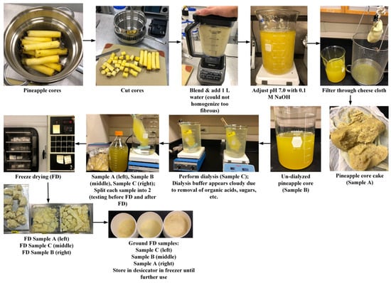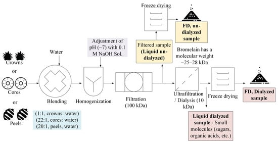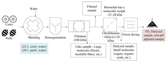 Approximately 1 kg of pineapple cores was blended and homogenized with DIW at a ratio of 22:1 (w/w). Then, the homogeneous mixture was filtered, dialyzed, and FD to produce FD bromelain powders from pineapple cores (Figure 4). Alternatively, FD bromelain powders were produced following the process previously described, except for the dialysis step.