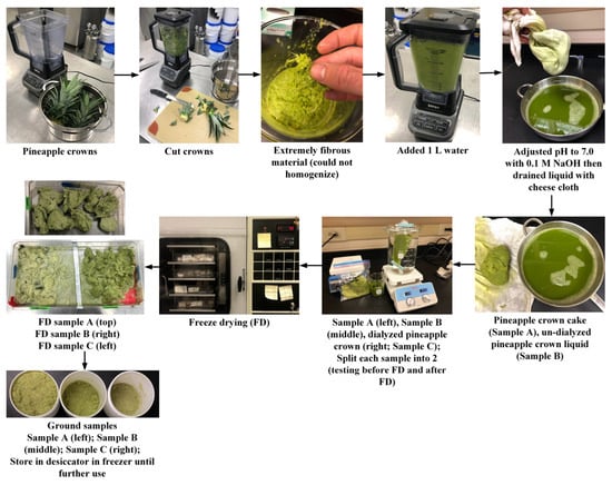 Fresh pineapple and basal stems were obtained from a pineapple plantation located in Costa Rica. First, an import permit was obtained from the U.S. Department of Agriculture (USDA)—Animal and Plant Health Inspection Services (APHIS). Then, the fresh samples were shipped to the UGA FoodPIC facilities. Upon arrival, the samples were stored at −20 °C until needed for experiments and analysis.