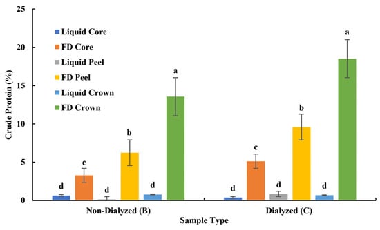The preliminary results indicated that the bromelain powders from pineapple crowns had significantly (p < 0.05) higher crude protein than the powders made from peels and cores (Figure 4). As expected, the FD powders had significantly (p < 0.05) higher crude protein than the liquid samples before freeze-drying. Furthermore, dialysis significantly (p < 0.05) increased the crude protein content of the bromelain powders.