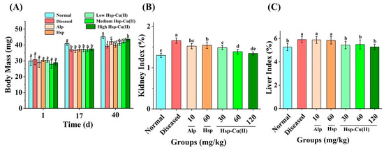 Effect of Hsp-Cu(II) complex on (A) body weight, (B) kidney index, and (C) liver index in the HUA mice. Results are expressed as mean ± SD of 10 samples per group. Values with different superscript letters are significantly different (p < 0.05).