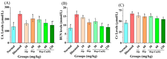 Effect of Hsp-Cu(II) complex on serum physicochemical indexes of (A) UA, (B) BUN, and (C) Cr in the HUA mice. Results are means ± standard deviation, n = 10 per group. The different letters represent a significant difference (p < 0.05).