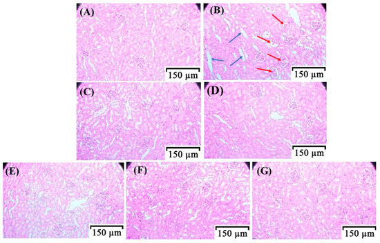 Effect of Hsp-Cu(II) complex on the histopathology of kidney tissue of HUA mice. (A) Normal, (B) Diseased, (C) Alp, (D) Hsp, (E) LHC, (F) MHC, and (G) HHC. The red arrows pointed to the glomerular atrophy and necrosis; the blue arrows pointed to the tubular edema and fibrosis.