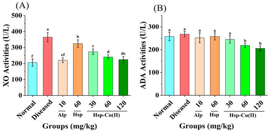 Effect of Hsp-Cu(II) complex on the activity of (A) XO and (B) ADA in the liver of HUA mice. Results are means ± standard deviation, n = 10 per group. The different letters represent a significant difference (p < 0.05).