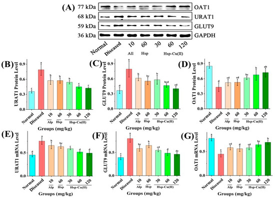Effect of Hsp-Cu(II) complex on protein mRNA expression of the UA transporters in HUA mice. (A) Western blot analysis, the expression level of (B) URAT1, (C) GLUT9, and (D) OAT1. The mRNA expression level of (E) URAT1, (F) GLUT9, and (G) OAT1. Data are presented as the mean ± SD of three independent experiments. The different letters represent a significant difference (p < 0.05).
