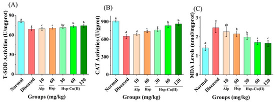 Effect of Hsp-Cu(II) complex on the activities of (A) T-SOD, (B) CAT, and (C) MDA level in HUA mice. Results are means ± standard deviation, n = 8 per group. The different letters represent a significant difference (p < 0.05).