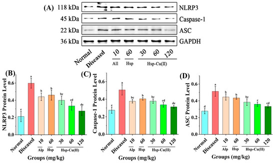The NLRP3 pathway contains three proteins and they do not cause inflammation when these three proteins are dissociated in cells [47]. Only when sensing pathogen-associated molecules or danger-associated molecules, the three proteins will gather together to assemble NLRP3 inflammatory bodies and induce inflammation, the ASC (apoptosis-associated speck-like protein containing a CARD) in the nucleus will be released into the cytoplasm as a protein bridge recognition adapter, and its N-terminal PYD will bind to the NLRP3 through oligomerization [48]. Meanwhile, the CARD at the other end recruited Pro-Caspase-1, the precursor of Caspase-1 (cysteinyl aspartate specific proteinase-1), to assemble inactive NLRP3 inflammatory body precursors [15,49]. When the Pro-Caspase-1 on the precursor of the inflammatory body is cut into Caspase-1, it can be activated into bioactive mature NLRP3 inflammatory bodies to mediate the production of a large number of cytokines [50]. In Figure 7, in the Diseased group, the NLRP3, ASC and Caspase-1 protein expression levels were notably raised, (p < 0.05). With increasing the dose of the Hsp-Cu(II) complex, the level of NLRP3, Caspase-1, and ASC significantly reduced, and their reductions by the MHC group were 44.2%, 30.0%, and 33.6%, respectively. Interestingly, the three proteins expression levels in the HHC group were found to be close to those in the Normal group. The Alp and Hsp groups showed almost the same effect on the reduction in the three proteins, but their effects were only similar to those of the LHC group (p > 0.05), and the reductions were about 33.1% (NLRP3), 25.3% (Caspase-1) and 25.1% (ASC). The aforementioned results clarified that the Hsp-Cu(II) complex better inhibited the NLRP3 inflammatory pathway than Hsp and Alp.