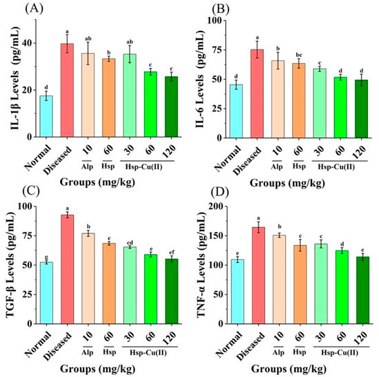Effect of the Hsp-Cu(II) complex on the level of (A) IL-1β, (B) IL-6, (C) TGF-β, and (D) TNF-α cytokines in the kidneys of HUA mice. Results are means ± standard deviation, n = 6 per group. The different letters represent a significant difference (p < 0.05).