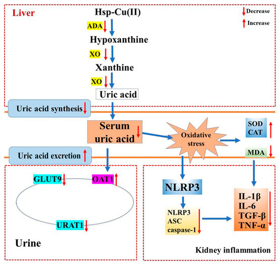 Therefore, a mouse diseased of HUA was conducted to study the Hsp-Cu(II) complex’s impact on the serum uric acid, blood urea nitrogen and creatinine level, cytokines, renal injury, and activities of key enzymes (XO and ADA) in the liver and SOD and CAT in the kidneys. The regulation of the complex on the expression of related renal UA transport proteins (including URAT1, GLUT9, and OAT1) and the NLRP3 inflammatory pathway in the mice, and the hypouricemic and nephroprotective effects and mechanisms of the complex were then explored. This investigation can provide a rationale and laboratory guidance for the study and exploitation of Hsp-Cu(II) complexes as food supplements or nutraceuticals with UA-lowering effects.
