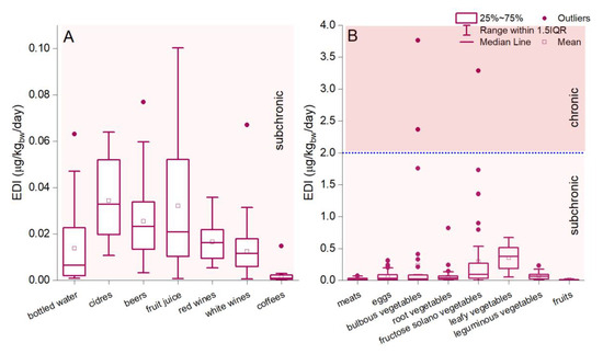 The health risk assessment represents an essential tool for understanding health risks in human activities and indicating evidence for decision-makers. The EDI evaluation methodology was defined by the US Environment Protection Agency’s (US EPA) methodology [56,57]. The results showed that the estimated daily intake of Li via beverage ingestion (0.0002–0.89 µg/kgbw/day) is considerably lower than in the case of food ingestion (0.006–3.76 µg/kgbw/day) (Figure 2A,B). The descending order of the average value of EDILi via food and beverage ingestion decreases as follows: leafy vegetables > fructose solano vegetables > bulbous vegetables > leguminous vegetables > eggs > root vegetables > ciders > fruit juices > beers > meats > red wines > bottled water > white wines > fruits > coffee (Figure 2). The estimated daily intake associated with beverage ingestion, calculated in the present study, is mainly comparable to or lower than other reports. Environmental Li exposure and population diet intake can vary significantly depending on regions, and more or less rely on Li content in food and beverages. Several examples can be referenced for an adult (70 kg body weight) diet, including Italy (0.038 μg/kgbw/day) [57]; Belgium (0.12 μg/kgbw/day) [98]; France (0.69 μg/kgbw/day) [83]; the UK (0.23 μg/kgbw/day) [99]; Vietnam (0.51 μg/kgbw/day) [100]; New Zealand (0.29–0.41 μg/kgbw/day) [101]; and Canary Islands (0.05 mg/kgbw/day) [17]. Similar studies confirmed significant daily Li intake via ingesting fresh fruits, vegetables, milk, and dairy products [55,57].
