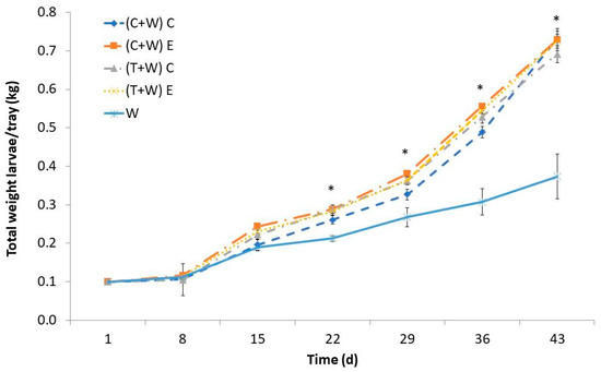 Larval weight of T. molitor determined weekly while feeding for 43 days with different diets [(C + W) C: cucumber waste + wheat bran, conventional crop; (C + W) E: cucumber waste + wheat bran, ecological crop; (T + W) C: tomato waste + wheat bran, conventional crop; (T + W) E: tomato waste + wheat bran, ecological crop; W: wheat bran]. Asterisks (*) indicate statistical difference (p < 0.05) between the larval weight of those fed with W (control diet) and that of those supplemented with vegetable wastes at the same rearing time. Values are expressed as mean ± standard deviation (n = 5).