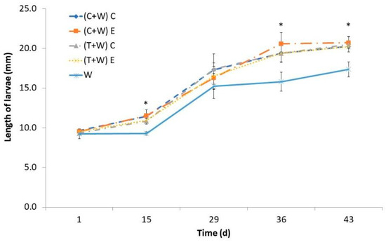 Larval length of T. molitor determined every fortnight while feeding for 43 days with different diets [(C + W) C: cucumber waste + wheat bran, conventional crop; (C + W) E: cucumber waste + wheat bran, ecological crop; (T + W) C: tomato waste + wheat bran, conventional crop; (T + W) E: tomato waste + wheat bran, ecological crop; W: wheat bran]. Asterisks (*) indicate statistical difference (p < 0.05) between the larval length of those fed with wheat bran (control diet) and that of those supplemented with vegetable wastes at the same rearing time. Values are expressed as mean ± standard deviation (n = 5).