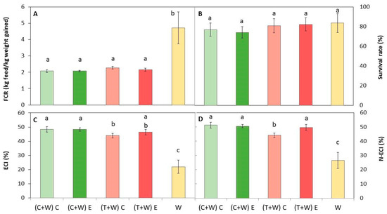 The survival rate, feed conversion ratio (FCR), the efficiency of conversion of ingested feed (ECI), and nitrogen conversion efficiency (N-ECI) were calculated according to the following equations [11,18]: