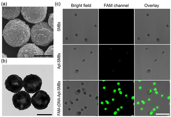 Characterization of the prepared FAM-cDNA-Apt-SMBs. (a) SEM and (b) TEM images of the FAM-cDNA-Apt-SMBs. Scale bar: 1 μm. (c) CLSM images of the SMBs, Apt-SMBs, and FAM-cDNA-Apt-SMBs. Scale bar: 10 μm.