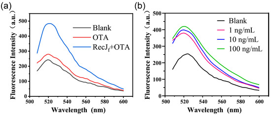Feasibility analysis of the exonuclease-assisted aptasensor through fluorescence spectroscopy at 480 nm excitation wavelength. (a) The fluorescence emission spectra of the supernatant from blank, OTA, and OTA plus the RecJf exonuclease groups. (b) The fluorescence responses of the exonuclease-assisted aptasensor to different concentrations of OTA (0, 100 ng/mL, 1 μg/mL, and 10 μg/mL).