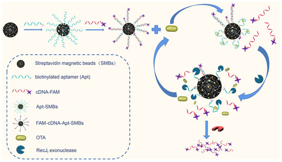 Exonuclease-assisted target recycling amplification is an alternative method that does not suffer from the drawbacks of nucleic acid amplification. Specifically, the RecJf exonuclease, as a single-stranded DNA (ssDNA)-specific exonuclease, can catalyze the removal of deoxy-nucleotide monophosphates from ssDNA in the 5′-to-3′ direction. Whereas other exonucleases usually act only on individual DNA strands [19,20], the RecJf exonuclease can also gradually hydrolyze the aptamer–target complex from the DNA strand and release the target for recycling [21,22,23]. Compared with nucleic acid amplification methods, RecJf exonuclease-induced target recycling can constantly amplify specific signals that are dependent on target aptamer recognition. A type of specific signal amplification can be achieved without complex primer design or the addition of multiple enzymes, thus avoiding the instability and non-specific amplification associated with complex system. RecJf exonuclease-induced signal amplification has been widely applied in a variety of electrochemical aptasensors [21,22,23], but it has seldom been used for fluorescence assays. Currently, fluorescence analysis is an accessible detection method that has reached a high level of commercialization. Herein, we introduce RecJf exonuclease-induced signal amplification enabling ultrasensitive fluorescence analysis in a universal aptamer-based magnetic separation system. Fluorescein-labeled complementary DNA (cDNA-FAM) was first hybridized with aptamers immobilized on magnetic beads, making the 5′ terminal of the aptamer hidden in the aptamer/cDNA-FAM duplex in the absence of targets. When the aptamer/cDNA-FAM duplex recognizes target OTA, cDNA-FAM is released into the supernatant, forming an OTA/aptamer complex on magnetic beads. At the same time, RecJf digests the ssDNA aptamer in the OTA/aptamer complex in the direction from 5′ to 3′, resulting in the release of the target OTA. Thus, the target OTA continuously exposes the 5′ terminal of the aptamer and triggers cleavage cycling to efficiently amplify cDNA-FAM signals in the supernatant. Through this mechanism, the aptasensor may be used to detect OTA with excellent sensitivity and specificity. Importantly, the proposed method exhibited good practical performance in OTA detection in cereal products, suggesting its practical applicability in food safety analysis.