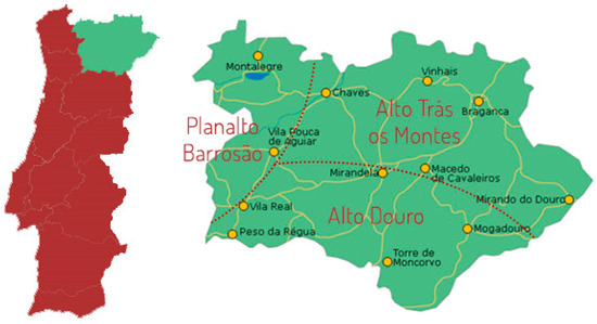 Figure 1. Map of the geographical location of different alheira collection sites. The dotted lines indicate three Northern Portuguese regions: Planalto Barrosão, Alto Trás-os-Montes and Alto Douro. Source: Instituto Nacional de Estatística (INE).