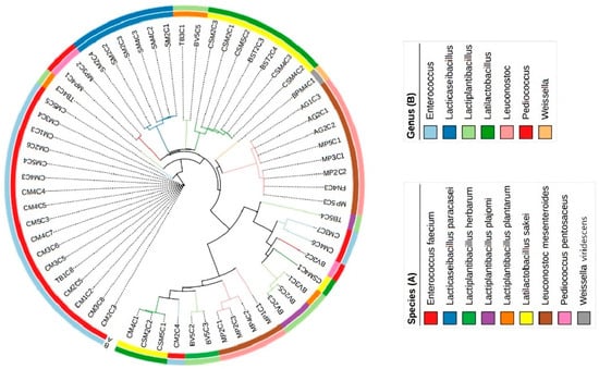 Figure 2. Phylogenetic tree of 16S rRNA sequences from LAB isolates with information at species (A) and genus (B) level.