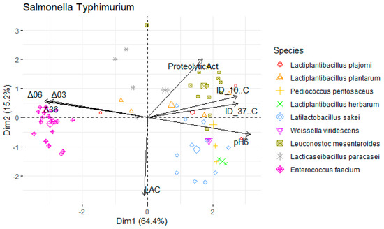 Figure 5. Map of the first and second principal components of the tested technological properties of lactic acid bacteria (LAB) against Salmonella Typhimurium isolated from alheira sausage and species identification of LAB isolates. Legend: See Section 2.6.3.