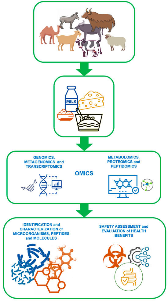 Consequently, different functional health benefits have been found, e.g., compared to bovine milk, some studies suggest that milks from small ruminants (e.g., goat) cause fewer allergenic reactions due to the protein concentration and polymorphism [16,17]; similarly, conjugated linoleic acid and orotic acid in sheep milk aid the treatment and prevention of type 2 diabetes, cancer, and other diseases [16]. Non-bovine milk products are also good for isolating novel potential probiotics and probiotic carrier candidates [17]. Similarly, novel peptide sequences or peptides with improved stability, bioavailability, and efficiency could be obtained [15]. Taking into account this context, we firstly provide an overview of the detection and characterization of probiotics and BPAs in milk and milk-derived products as well as an updated review of their health-promoting properties; a careful consideration on the safety of probiotics and BPAs will also be given. In addition, we will provide an overview of the current state of the art, forthcoming challenges and tendencies of probiotics and BPAs in milk and its derivatives as well as their role in human health. Moreover, an overview of foodomics used to detect and characterize these healthy products/microorganisms will be provided.