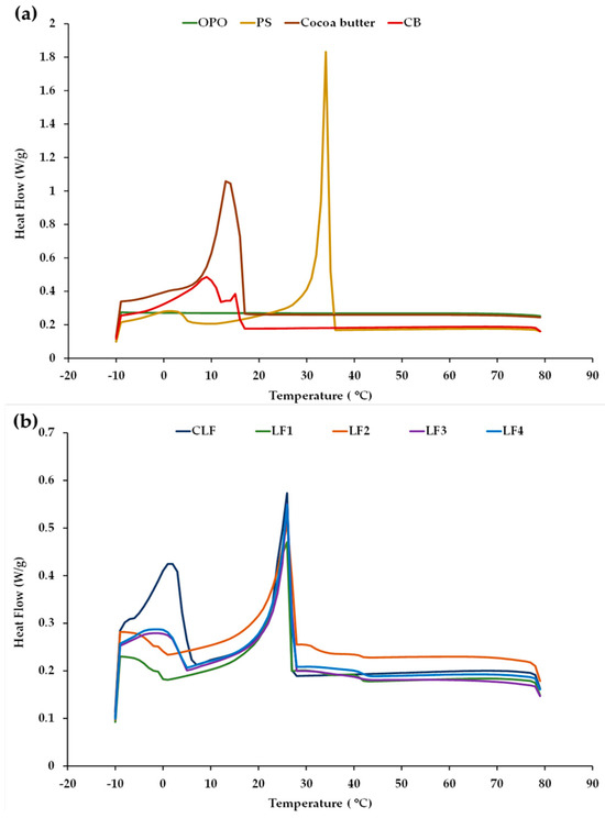 Examples of the cooling thermograms obtained for LF1–LF4 after 3 days of storage, for the OPO, PS, and cocoa butter ingredients, and for the commercial controls CB and CLF are shown in Figure 1. For clarity, the profiles of OPO, PS, cocoa butter, and CB are grouped together (Figure 1a), while the profiles corresponding to the CLF are shown together with those obtained for the LF samples containing OPO (Figure 1b). No apparent differences in the cool flow patterns were detected at 60 days when compared to those observed after 3 days, suggesting sustained thermal stability for all the different LF samples during chilling storage under the given conditions.