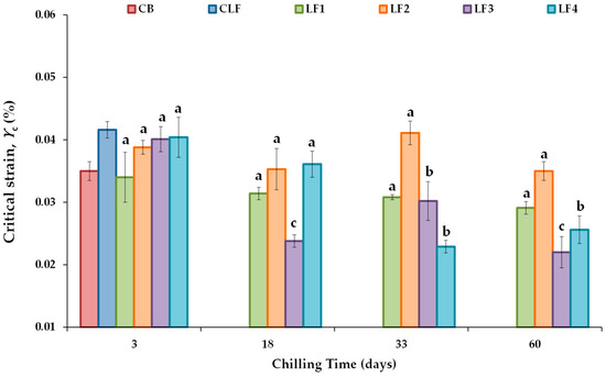 Critical strain (γc) values from stress sweep tests for the different laminating fats tested during chilling storage; shear stress ranged between 20 and 2000 Pa at 1 Hz and 20 °C. CB, control commercial butter; CLF, control commercial laminating fat; LF1–LF4, laminating fats formulated with olive pomace oil (OPO). Different letters for the same LF during chilling storage indicate significant differences (p < 0.05).