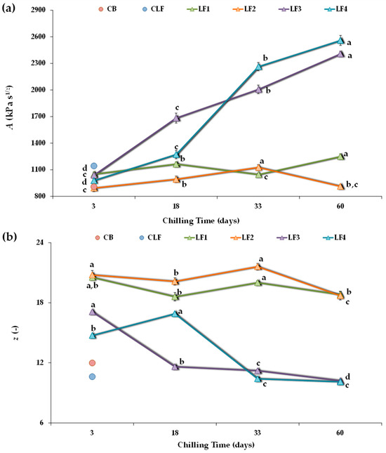 Regarding the studied effect of chilling storage time on each formulated LF, it is possible to observe that with increasing storage time, the model parameters changed more for LF3 and LF4 than for LF1 and LF2 (Figure 3). In both LF3 and LF4, a pronounced strengthening of the network occurred, and the A value significantly (p < 0.05) increased over time (Figure 3a) because interaction forces within the network increased [45]. In fact, for these LFs containing cocoa butter and lower OPO (31%) content, the A values after 60 days of storage were more than 2-fold higher than those after 3 days. However, although storage time also significantly affected the strength of the interactions in LF1 and LF2, there were no significant differences between the A values of LF1 after 3 and 33 days of storage, nor between those of LF2 after 3 and 60 days. Thus, the structural changes occurring during storage were mitigated by using OPO at a 41% concentration and without cocoa butter in the LF formulation.