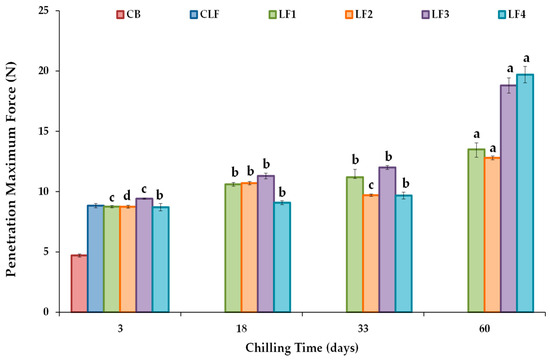 Conical penetration maximum force or firmness values at 20 °C for the different laminating fats tested during chilling storage. CB, control commercial butter; CLF, control commercial laminating fat; LF1–LF4, laminating fats formulated with olive pomace oil (OPO). Different letters for the same LF during chilling storage indicate significant differences (p < 0.05).