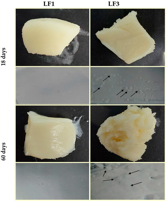 Images of laminating fats (LF1 and LF3) after 18 and 60 days of chilling storage at 4 °C. Granular crystals formed in LF3 are indicated with arrows.