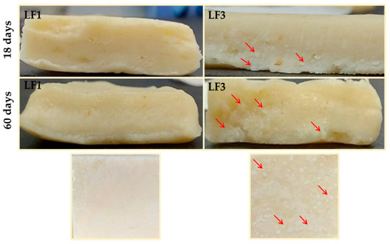 Figure 5 shows images of the LF pieces and LF spreads prepared with 41% OPO (LF1) and with 31% OPO and 10% cocoa butter (LF3) after 18 and 60 days of chilling storage. Similar images were obtained for samples LF2 and LF4.