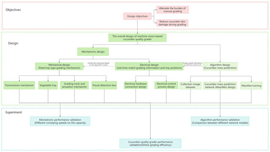 The cucumber quality grader design and experiments flow schematic is shown in Figure 2. Starting from the goal of reducing damage to the skin of North China type cucumbers during grading and alleviating the burden of manual grading, we designed a cucumber quality grader based on machine vision. The overall design of the grader includes a mechatronic design and algorithm design. In the mechatronic design, a fixed tray grading mechanism and an electrical control strategy for grading information and tray positions were developed, achieving real-time cucumber grading and protection. In the algorithm design, cucumber mass prediction was accomplished through the collection of image datasets, the design of a cucumber mass prediction network (MassNet), and training. In experiments, mechatronic performance was validated through capacity experiments at different conveying speeds. Algorithm performance was verified by comparing different network models and MassNet. The efficiency of the cucumber quality grader was confirmed through online experiments.