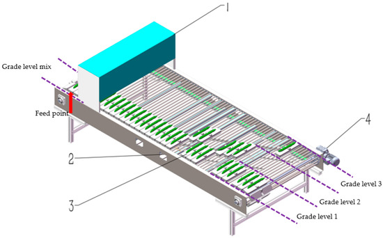 The overall structure and grading schematic of the cucumber quality grading machine. (1) vision detection box; (2) grading track with an actuation mechanism; (3) vegetable trays; (4) power unit.