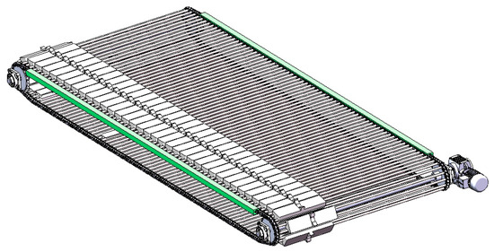 The transmission mechanism provides power for the entire grading and conveying system, using sprockets as illustrated in Figure 4. Both driving and driven sprockets have 27 teeth, with a transmission ratio of 1:1 and a sprocket center distance of 3500 mm. The overall operating condition involves low- to medium-speed operation under a light load. The roller chain is of type 16A, with a pitch of 25.4 mm. A stainless steel pipe with a diameter of 16 mm is installed on each chain link. Each vegetable tray is mounted on two adjacent stainless steel pipes, arranged in a single row. The entire power system utilizes a 750 W three-phase asynchronous AC motor, a 1:30 reducer, and a matching frequency converter to drive the sprockets’ rotation, with adjustable speeds ranging from 0.1 m/s to 0.5 m/s. During operation, the motor provides power, and the chain links engage with the driving sprocket, causing the vegetable trays mounted on the stainless steel pipes to move forward in the direction of the gear rotation.