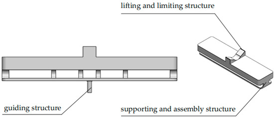 As a conveyor for susceptible cucumbers, the vegetable tray provides protection during the grading process. The dimensions of the tray are 400 mm × 97 mm × 55 mm, comprising lifting and limiting structure, supporting and assembly structure, and guiding structure, as shown in Figure 5. The lifting and limiting structure, in direct contact with cucumbers, incorporates a U-shaped structure in the middle, limiting the movement of cucumbers in the conveying direction. This prevents them from rolling or falling out of the tray due to sudden stops, speed changes, and other conditions, ensuring the quality of image acquisition by the camera and preventing damage to the outer skin of cucumbers. The supporting and assembly structure utilizes a multi-ribbed support structure to enhance the overall tray strength, with a design featuring 19 mm through-holes for assembly. The bottom guiding structure consists of a cylinder with a diameter of 10 mm and a height of 16 mm. To reduce inertia and weight, the upper and middle sections of the entire tray are designed with a hollow structure with a wall thickness of 2 mm, while the bottom guiding structure is solid. The material for the entire tray is chosen to be high-performance fiber-reinforced nylon, considering the wear and significant impact that the bottom guiding structure may experience during the grading process.
