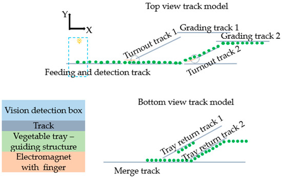 The grading track and the actuation mechanism are crucial components for diverting the vegetable trays according to the intended path. The grading track is divided into the top track and the bottom track, as shown in Figure 6. The top track includes the feeding and detection track, turnout tracks, and grading tracks. The bottom track consists of the tray return tracks and the merging track. All tracks are mounted on the supporting pipes inside the sprocket conveyor, and except for the turnout, other tracks are implemented using U-shaped aluminum profiles.