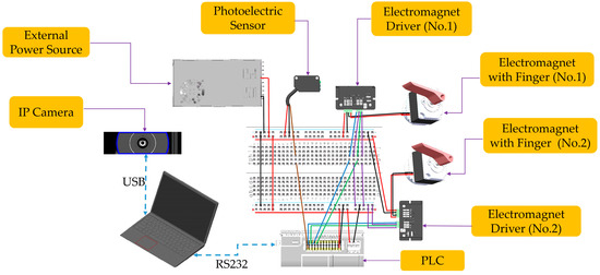 The electrical hardware comprises components such as cameras, photoelectric sensors, electromagnets with drivers, a computer, the PLC (Programmable Logic Controller), and the power supply. The hardware schematic is illustrated in Figure 7. The signal lines from the photoelectric sensor and the driver of the electromagnet are connected to the corresponding interfaces on the PLC. Communication between the PLC and the computer is established using the RS232, while the camera is connected to the PC via USB. A 220 V to 24 VDC power supply is employed to provide power to the electromagnets and other electronic components.