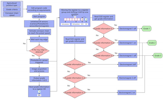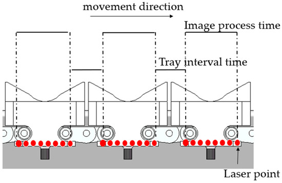 The electrical control process of the entire system is depicted in Figure 8. Prior to initiation, project parameters, such as agricultural product type, grading criteria, and conveyor chain speed, are configured in the program. Upon startup, various sensors (camera, photoelectric sensors, electromagnetic coils) and a computerized system are initialized. Once the chain speed reaches the predetermined velocity, the system awaits the arrival of the vegetable tray. When the laser emitted by the photoelectric sensor illuminates the edge of the vegetable tray, the PLC notifies the upper computer, and the camera captures the current image of the vegetables on the tray for image processing. The output includes grade information 1, 2, and 3. When the laser emitted by the photoelectric sensor reaches the end of the edge of the vegetable tray, the corresponding grade information is stored in register D0, associating the grade information with the respective tray. The time from the first laser detection at the edge of the tray to the end of the tray represents the image processing time. The tray interval time is the response time triggered by the photoelectric sensor, as illustrated in Figure 9. Subsequently, for each trigger of the photoelectric sensor, the grading information stored in the register is copied to the tray position register group D10 and shifted left by one bit. The width of D10 is 14 bits. The photoelectric sensor detects each vegetable tray, causing all grading information in the D10 position register array to shift by one bit. This approach ensures real-time synchronization and tracking of grading information and tray positions.