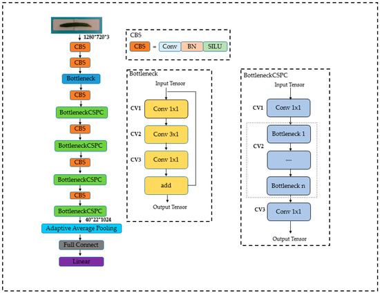 MassNet adopts a structure alternating between convolutional and CSPC (Cross-Stage Partial Connections), which processes input images layer by layer, extracts crucial features, and ultimately achieves accurate prediction of cucumber quality. All convolutional operations undergo batch normalization and SILU. In the initial two convolutional operations, the network gradually reduces the spatial size of feature maps while retaining image details. The use of Bottleneck, while maintaining the channel number, employs stacked convolutional layers to learn complex feature representations, and residual connections ensure gradient persistence. The alternating use of Conv and BottleneckCSPC, based on residual connections, further introduces Cross-Stage Partial Connections [32] to progressively reduce the spatial dimension of feature maps, increase the channel number, extract higher-level abstract feature modules, enhance the network’s feature learning capability, and improve the model’s ability to extract image features of different scales and complexities. Feature maps are reduced to a fixed-size vector through adaptive average pooling. This design ensures that the model has robustness for variations in the scale of input images, allowing it to better adapt to cucumbers of different sizes. Finally, the dimension-reduced features are input into fully connected layers for quality prediction. The architecture of MassNet is shown in Figure 10.