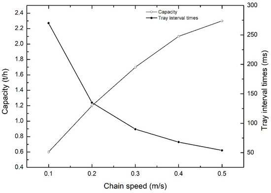 Figure 11 illustrates the capacity of the grader at chain speeds ranging from 0.1 m/s to 0.5 m/s, achieving a capacity range of 0.6 t/h to 2.3 t/h. Under chain speeds from 0 to 0.3 m/s, the capacity shows a linear increase with speed. The entire system operates stably, with long tray intervals and accurate readings from the photoelectric sensor for each tray. The grading actuating mechanism can make correct grading actions based on tray positions and bound quality information. Under chain speeds from 0.3 to 0.5 m/s, the capacity increase slows down. This is attributed to increased vibrations of the grader at higher chain speeds. Meanwhile, the short tray intervals lead to the photoelectric sensor mounted on the grader being influenced by equipment vibrations and interval times. This impact may result in missed readings or consecutive readings of vegetable trays, causing mismatches between tray position and quality information. Ultimately, this leads to the grading actuating mechanism failing to make the expected grading actions, reducing the overall capacity.