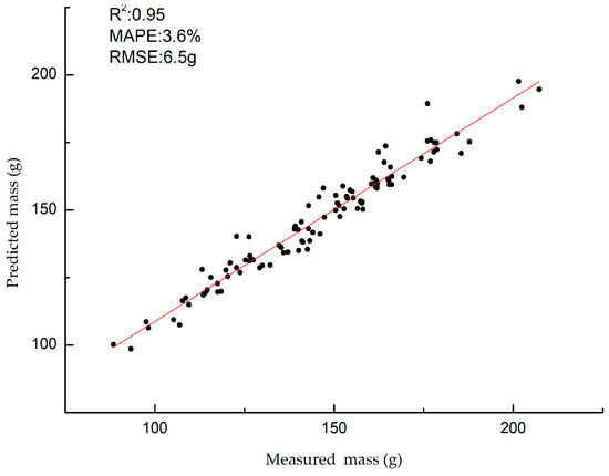 Figure 12 illustrates the relationship between the actual measured values and predicted values of the mass for 100 cucumbers obtained through the vision algorithm in the online grading experiment. The graph shows a strong linear correlation between the actual and predicted cucumber mass values, with an R2 of 0.95, MAPE of 3.6%, RMSE of 6.5 g, and grading speed of 60 pcs/min.