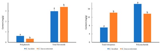 The bioactive constitutes content of GLU and GLE. Left: polyphenols and total flavonoids. Right: total triterpenes and polysaccharide. Different superscript letters indicate significant differences (p < 0.05) between GLU and GLE.