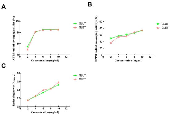 Antioxidant capacity of GLUT and GLET: (A) ABTS radical-scavenging assay; (B) DPPH radical-scavenging assay; (C) ferric reducing power assay.