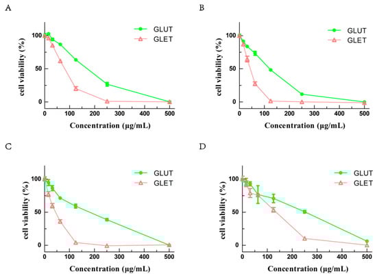 Cell viability of tumor cell after treatment with different concentrations of GLUT and GLET for 48 h: (A) A549 cells; (B) PC12 cells; (C) B16 cells; (D) Hela cells.